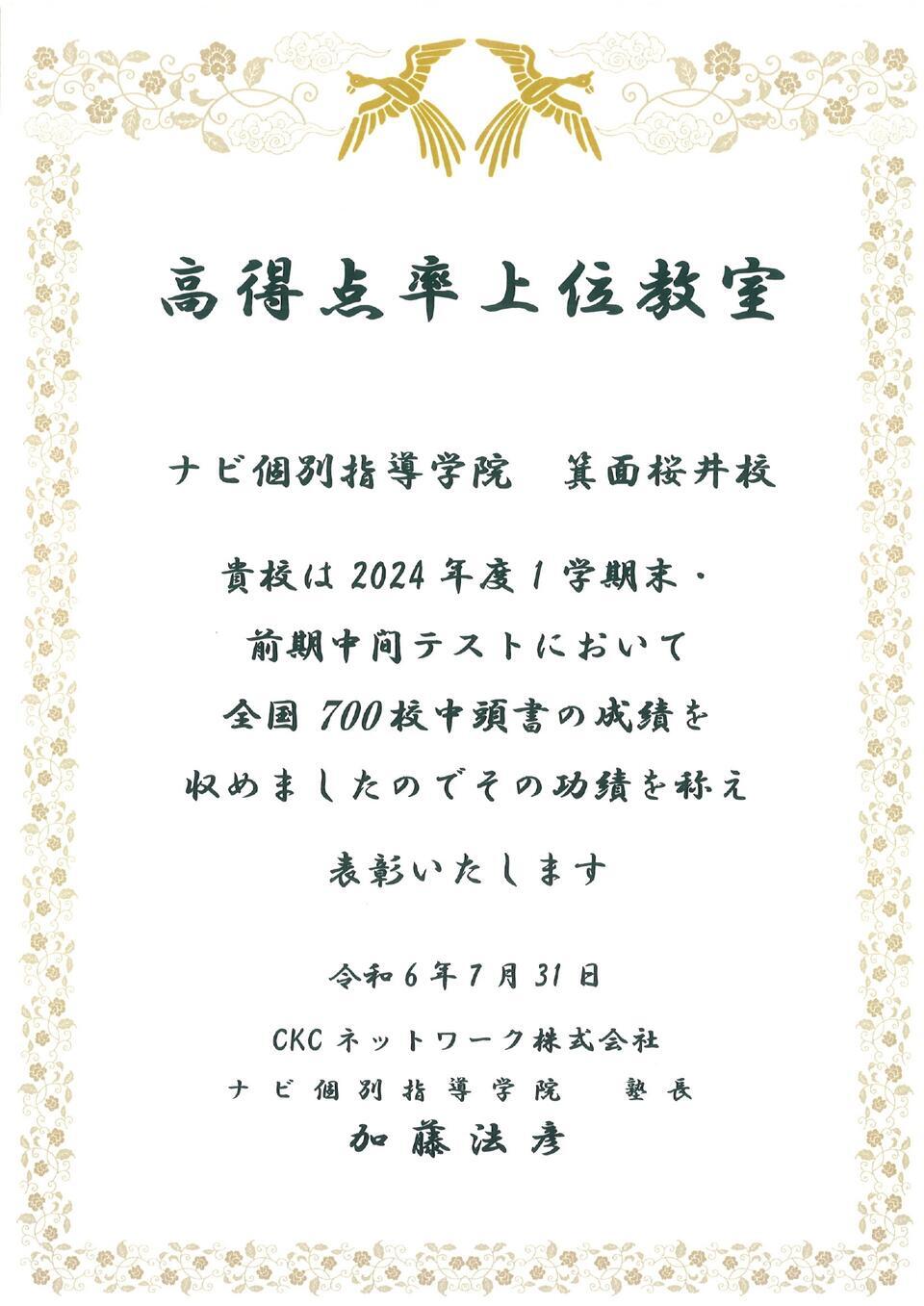 さて、今回は箕面桜井校が表彰されたのでご報告させていただきます。