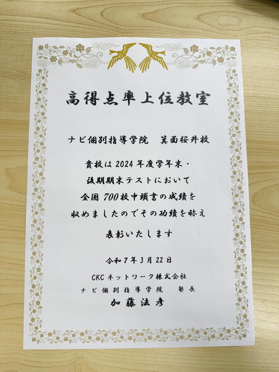 箕面桜井校が2024年度の学年末テストで表彰をいただけました!