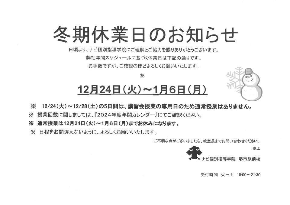 ナビ個別指導学院 堺市駅前校の冬期休業も生徒の皆さんにはお伝えしておりますが、こちらにも掲示させていただきます。
