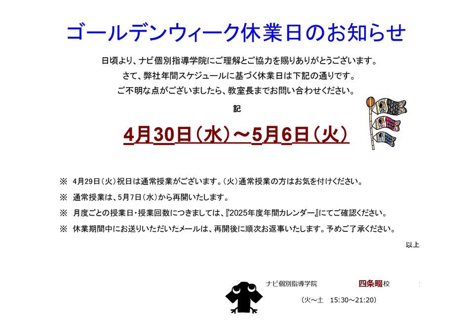 ナビ個別指導学院四条畷校もお休み期間と入ります。