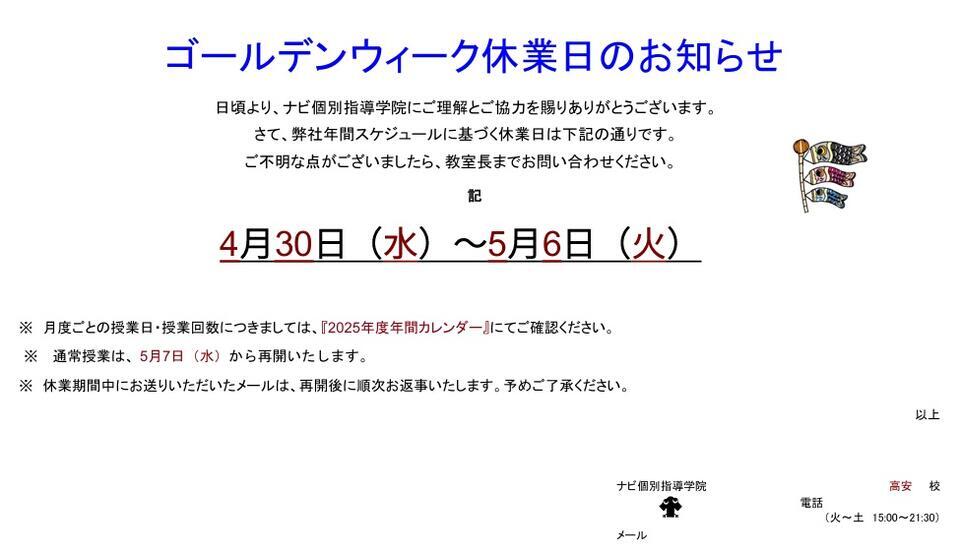 ナビ個別指導学院 高安校のGW休業も生徒の皆さんにはお伝えしておりますが、