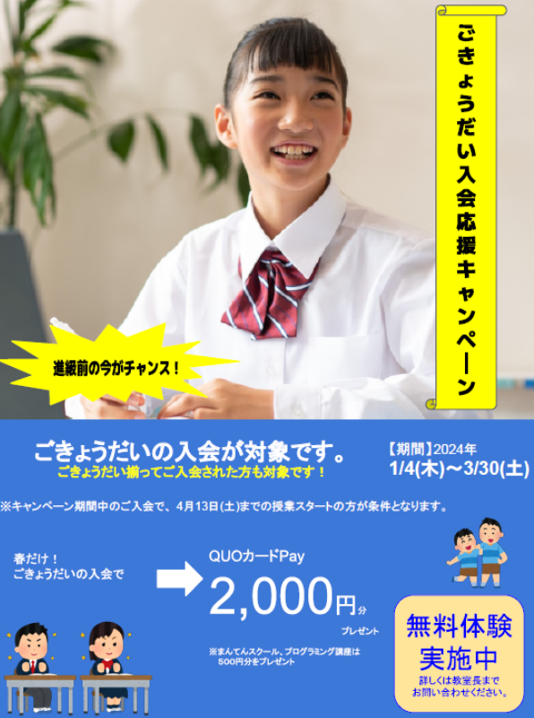 QUOカードPay 2,000円分プレゼントします。 (まんてんスクールは500円分)
