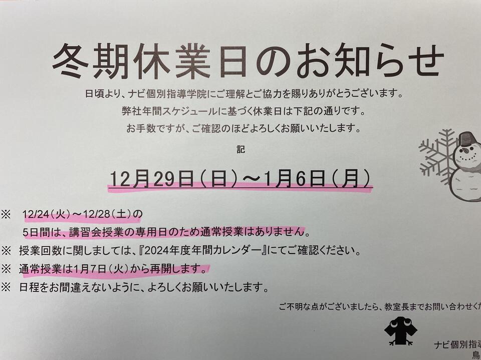 【12/24(火)~12/28(土)講習会専用日となっており通常授業はありません】