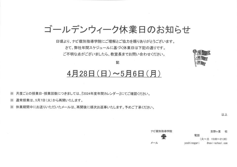 日頃より、ナビ個別指導学院にご理解とご協力を賜りありがとうございます。弊社年間スケジュールに基づく休業日は下記の通りです。ご不明な点がございましたら、教室長までお問合せ下さい。4月28日(日)~5月6日(月)⋆通常授業は、5月7日から再開いたします。⋆休業期間中にお送りいただいたメールは、再開後順次お返事いたします。予めご了承ください。⋆自習室も使用できませんのでよろしくお願いいたします。ナビ個別指導学院吉野ヶ里校