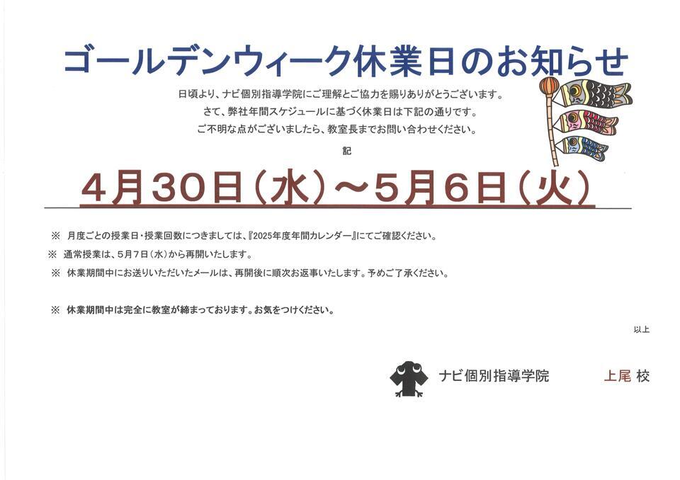 4月30日㈬から5月6日㈫まで、ナビ個別はGWのお休みです。