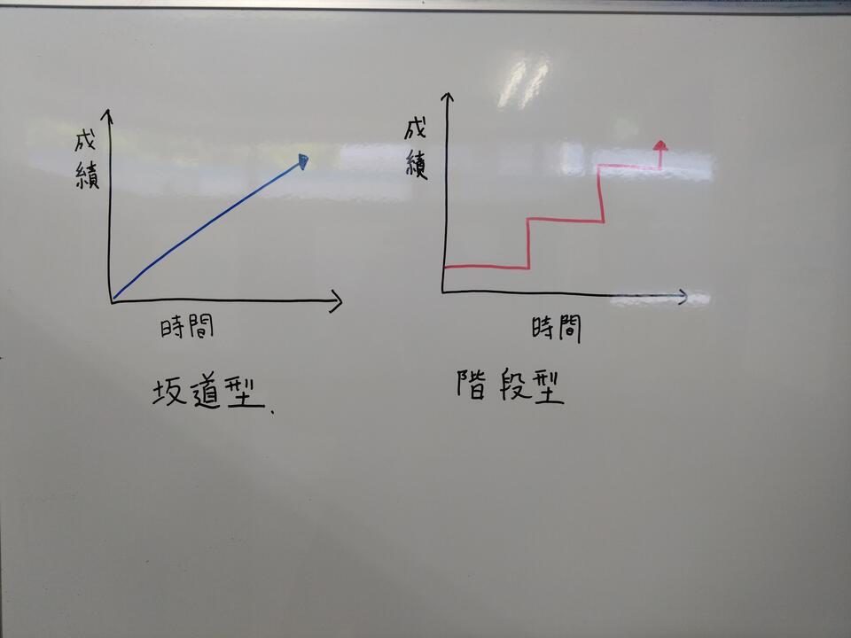 「時間と成果」の関係は、勉強時間と成果が正比例する「坂道型」と成果が身に見える形で現れるのにある程度の時間がかかる「階段型」の2通りがあります。(「坂道型」も「階段型」も便宜上そのように読んでいるだけではありますが)