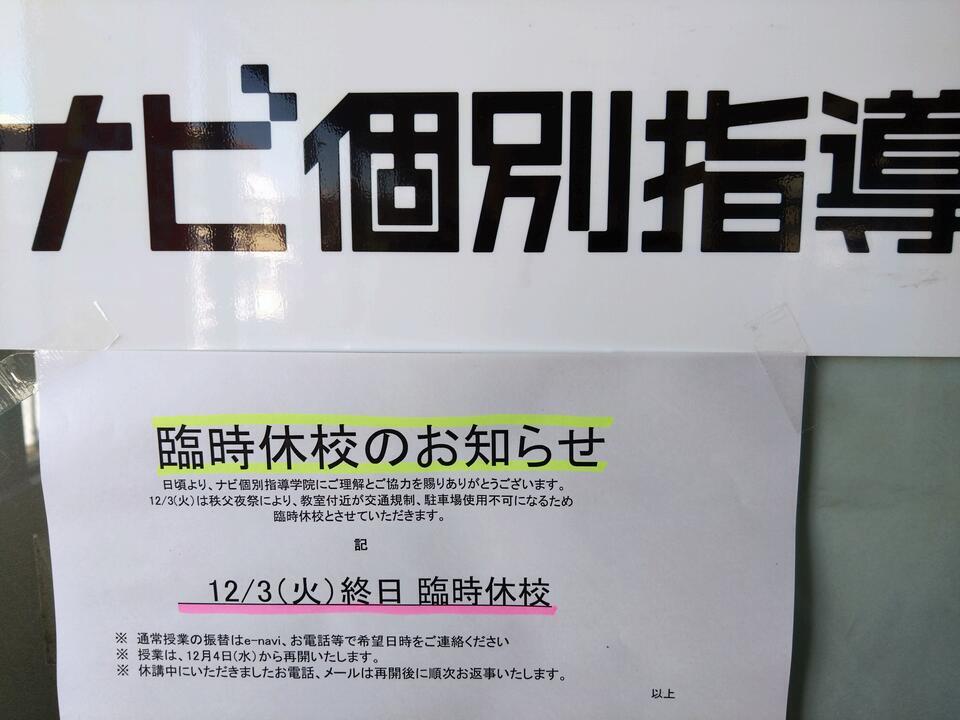 タイトルにもあるように12/3(火)ですがナビ個別指導学院秩父校は臨時休校とさせていただきます。