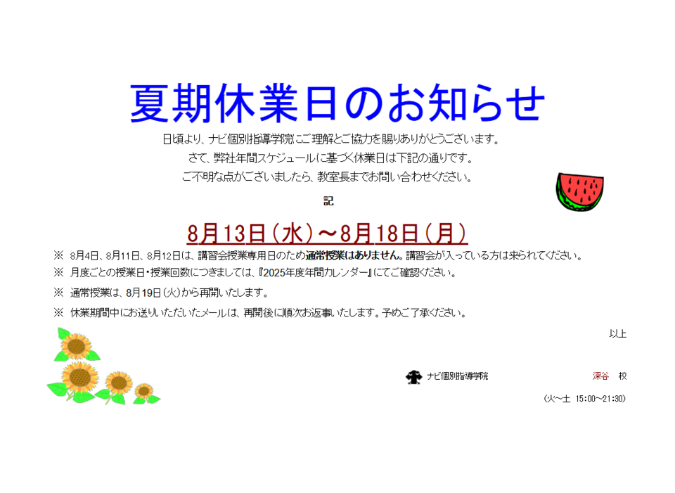 ※8月4日、8月11.12日は、講習会専用日のため通常授業はありません。