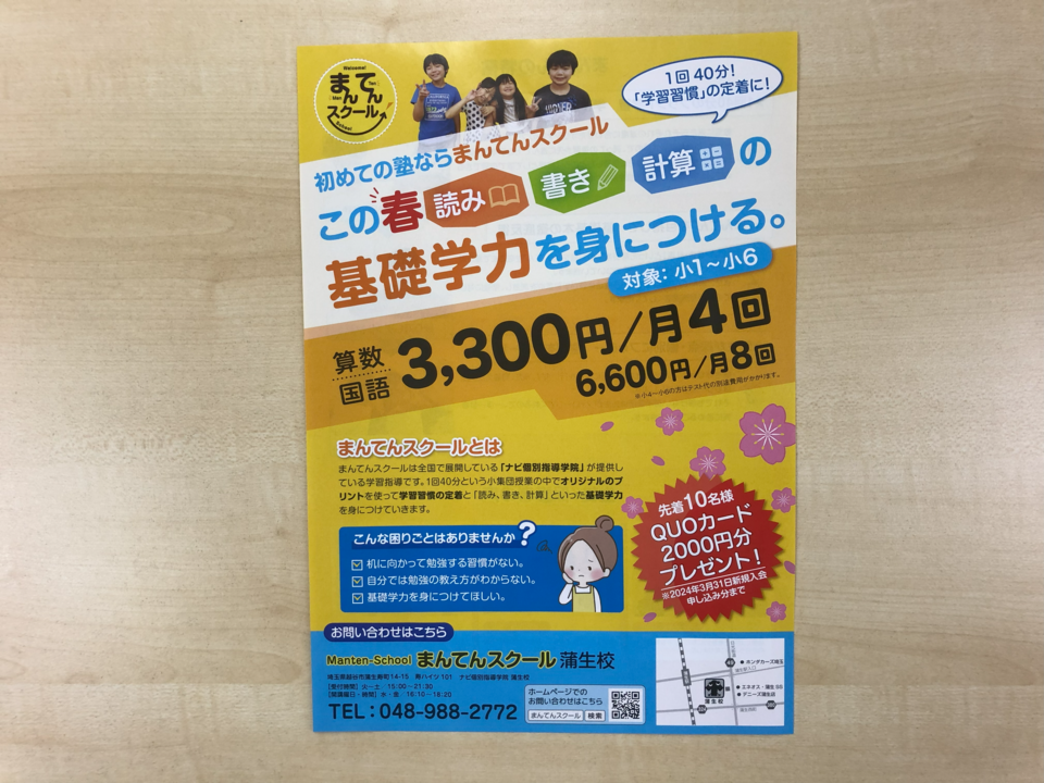2024年3月31日までに蒲生校の「まんてんスクール」にご入会いただいたお客様の中から、先着10名様に2,000円分のQUOカードを進呈いたしております。