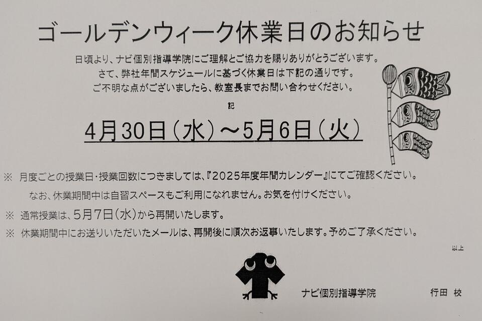 本日は、「ゴールデンウィーク休業日」の再度、お知らせです。