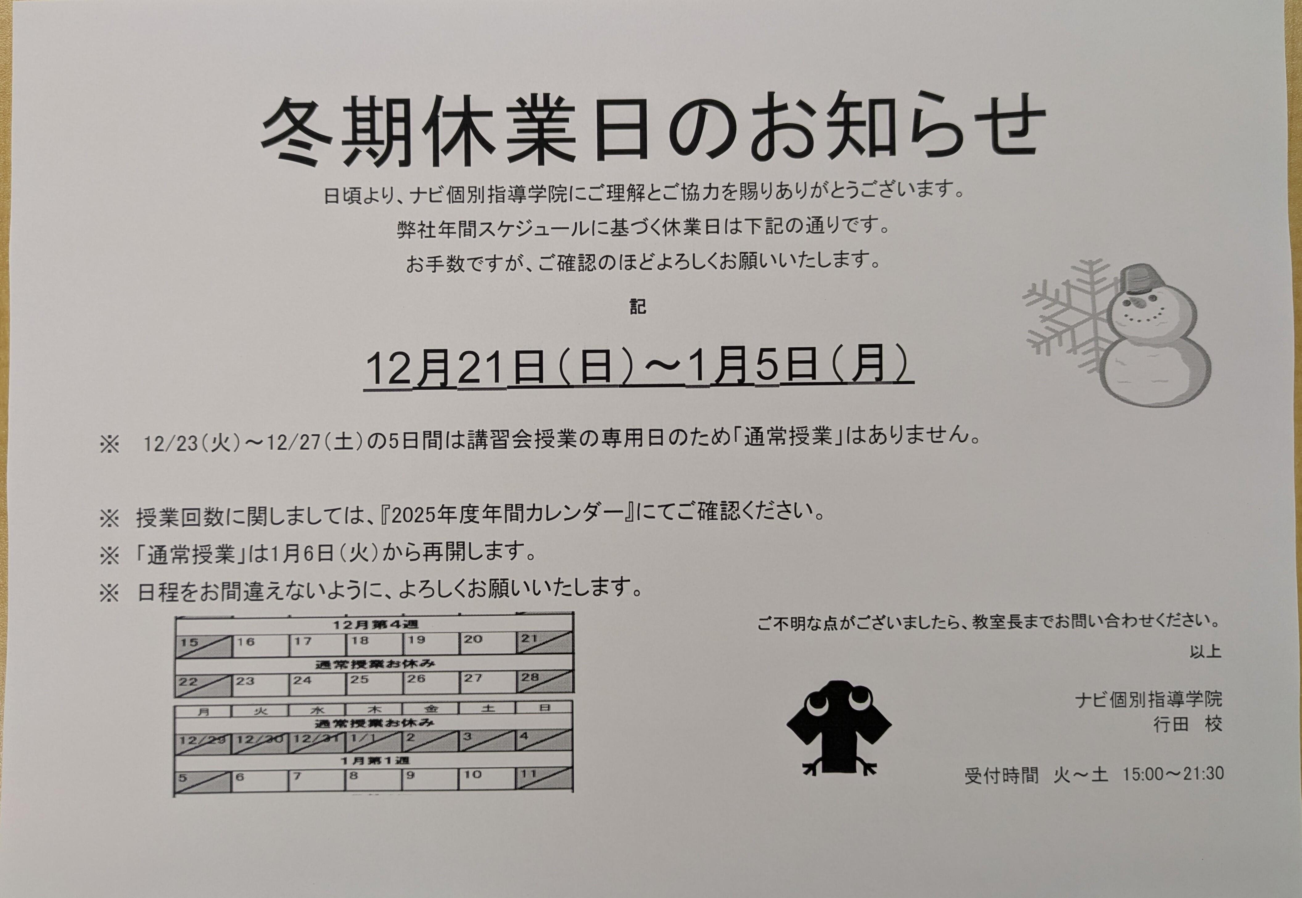 本日は、「冬期休業日のお知らせ」です。