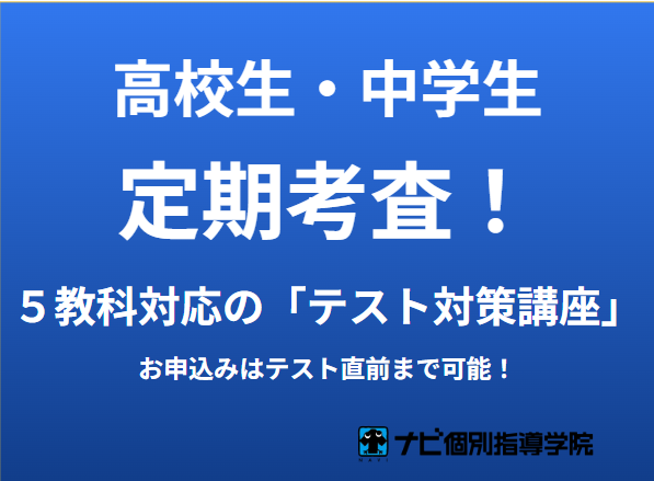 ナビ個別指導学院では、通常の授業とは別に定期テストの前にお申し込みいただける「テスト対策講座」のご案内もしております!