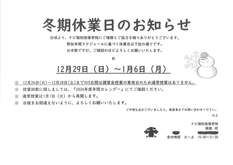 無料体験授業等も1月6日(月)からの再開になりますので、