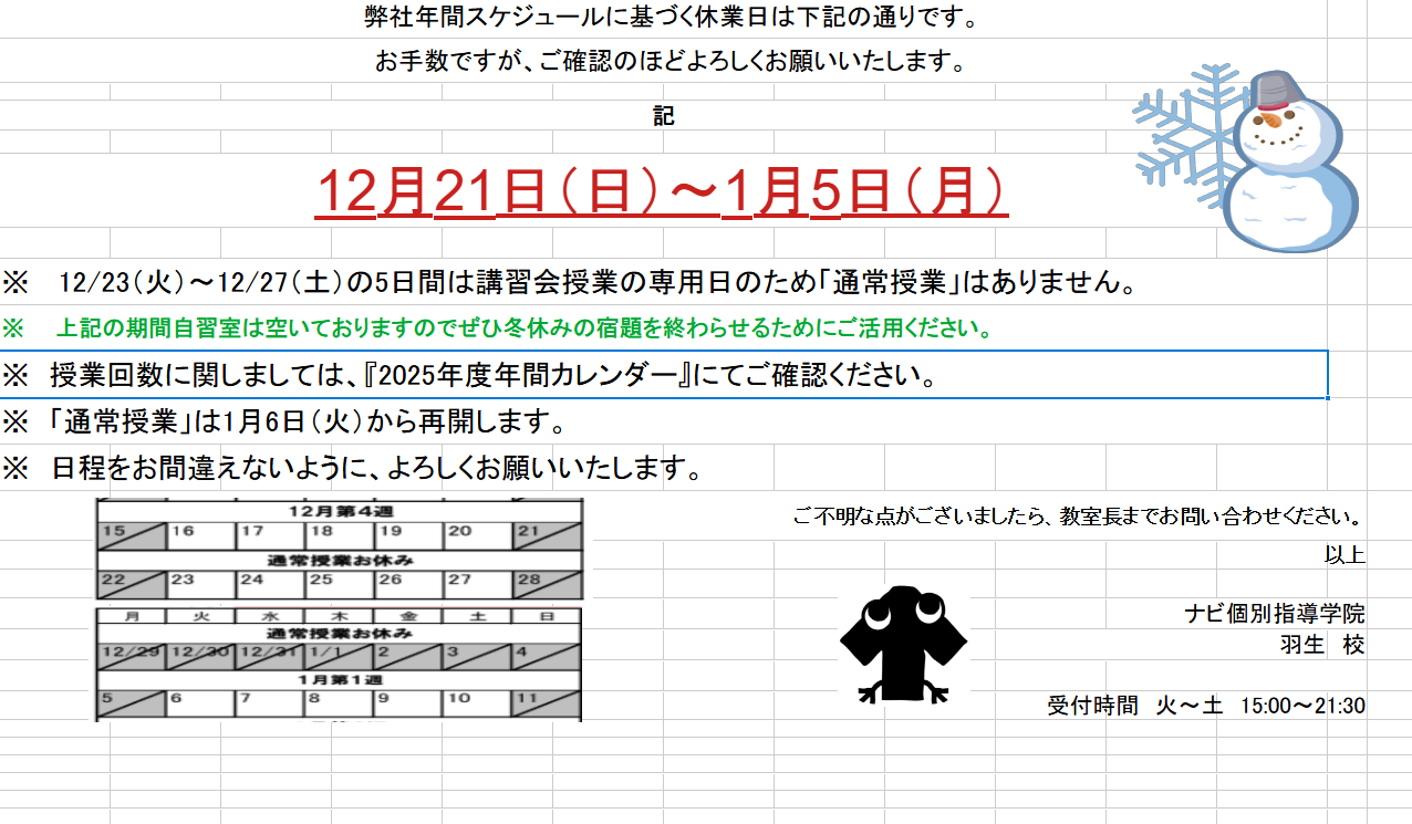 12/28㈰から1/5㈪は塾が完全にお休みで