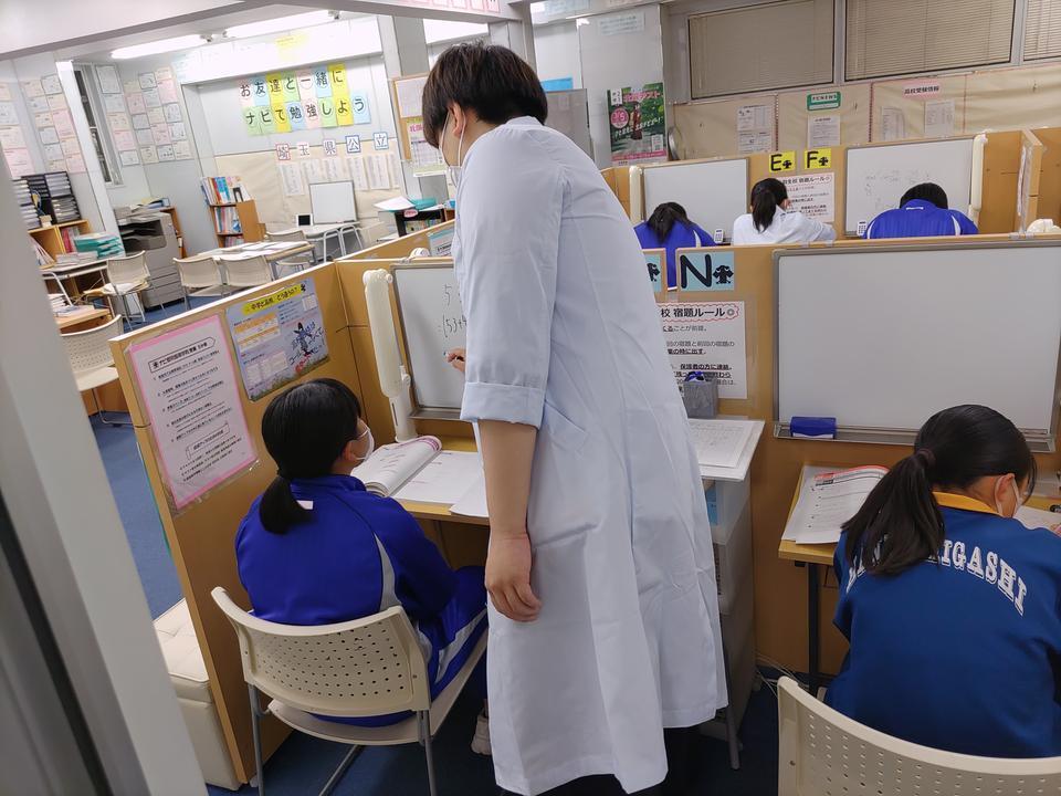 授業では出来るだけ、生徒自身に考えさせ、それでも分からないときに初めてヒントを与えて問題を解かせています。