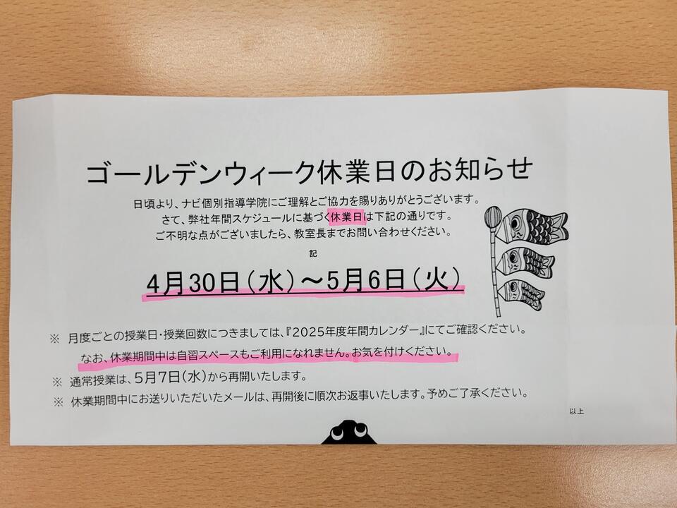 本日はナビ個別指導学院羽生校のゴールデンウィークのお休みのお知らせをいたします。