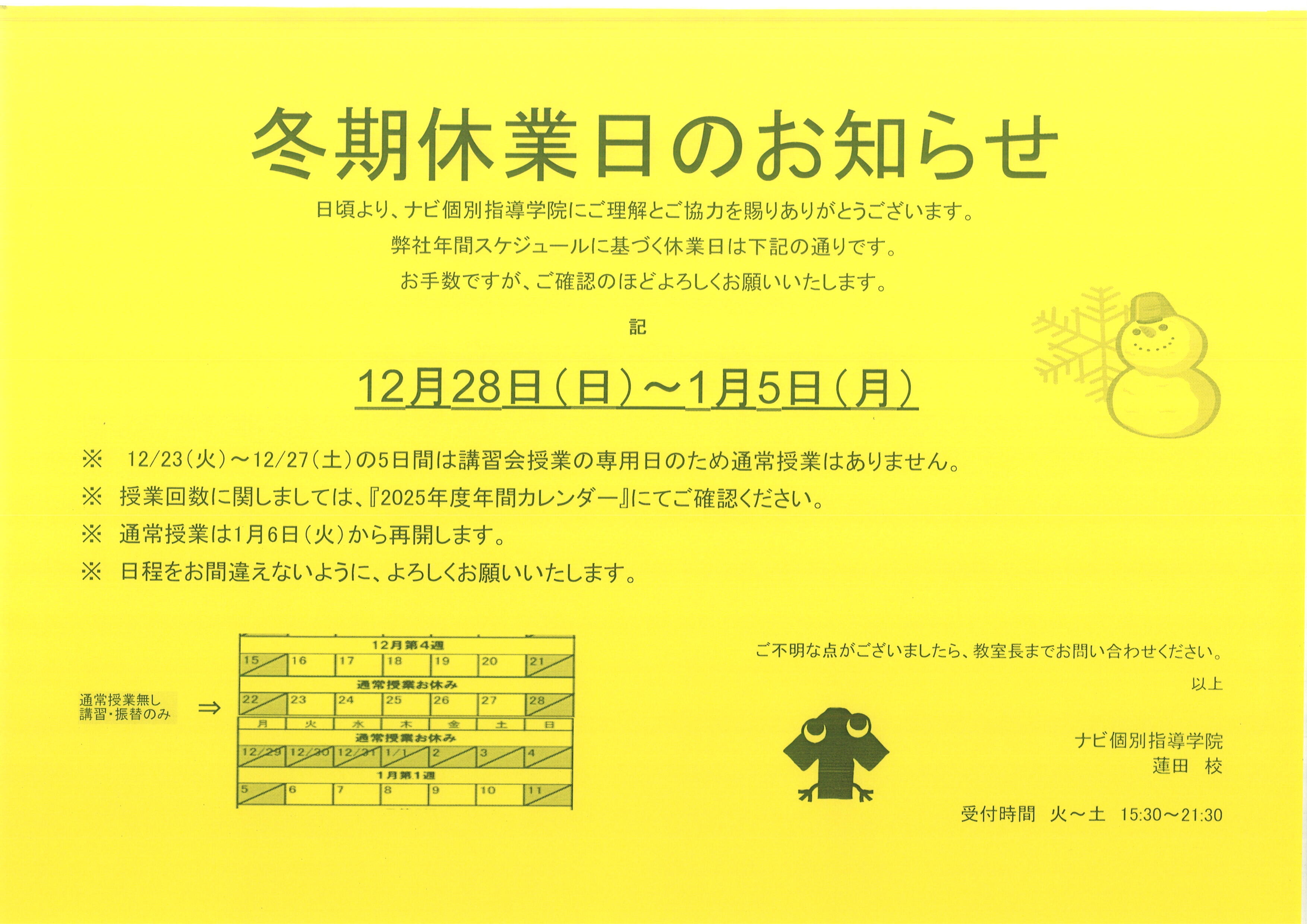 通常授業再開は 1月6日(火)からとなります。