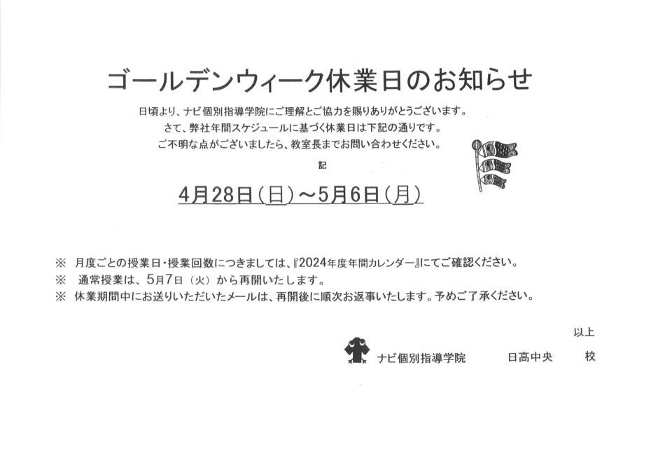 4月28日(日)~5月6日(月)まではGW休業日となっております。