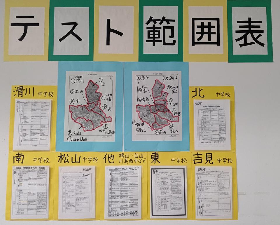 例年、東松山市南中学校が最もテスト日程が早く、松山中学校が最も後の日程であることが多いのも特徴です。また、新1年生は1学期中間テストのみ非実施の中学校もあります。