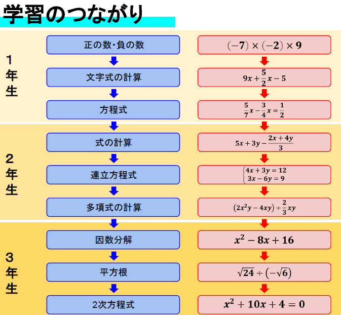 「比例反比例」は、2年生で「一次関数」、3年生で「二次関数」