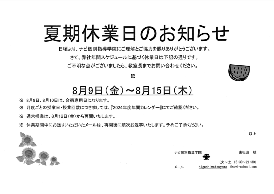 8月9日(金)~15日(木)の間は夏期休業期間となります。