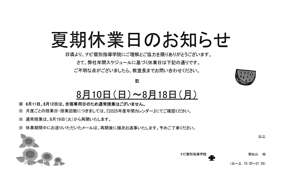 ※休業期間中は、授業・自習室利用は全て停止となります。