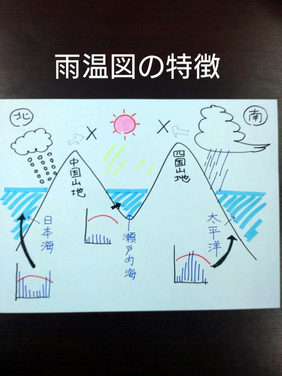 以上のことから夏場に多くの降水量があり1年通しての平均気温が高い雨温図は太平洋側の気候、冬場に多くの降水(雪)量が特徴の雨温図は日本海側の気候、年間少雨で平均気温が高い雨温図は瀬戸内海の気候であることがわかります。