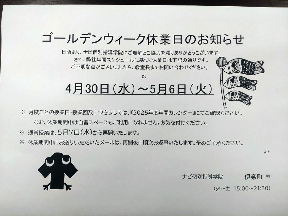 当校は4/30~5/6はゴールデンウィーク休業となり、体験授業・自習スペースともにご利用になれません。