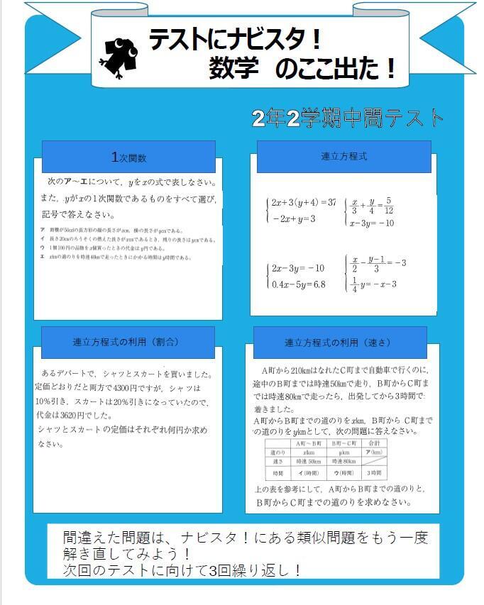 今回その中でも、中2の連立方程式や1次関数は、ナビ個別指導学院の授業で使用しているテキストの中からも類題が出ています。
