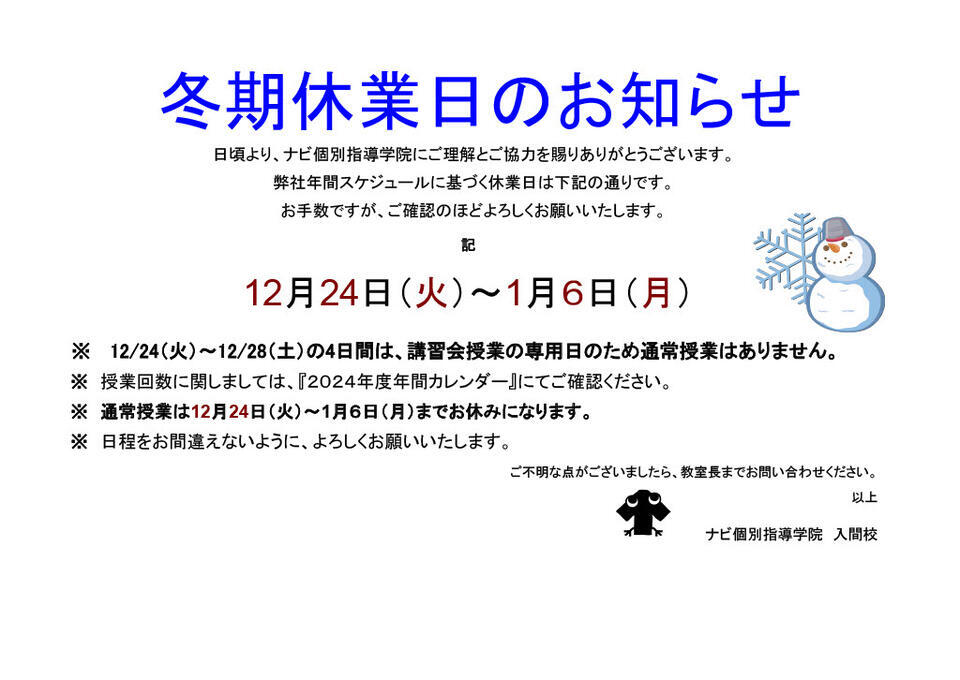 通常授業は12/21(土)まで実施、12/24~12/28は講習会専用日となります。