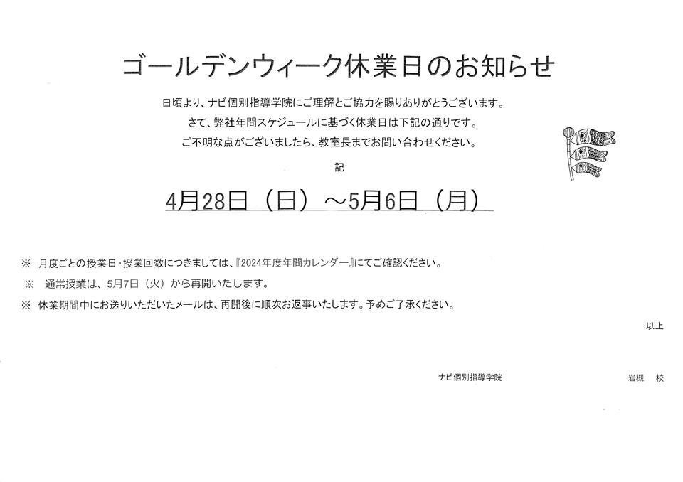4月28日(日)~5月6日(月)まではGW休業日となっております。