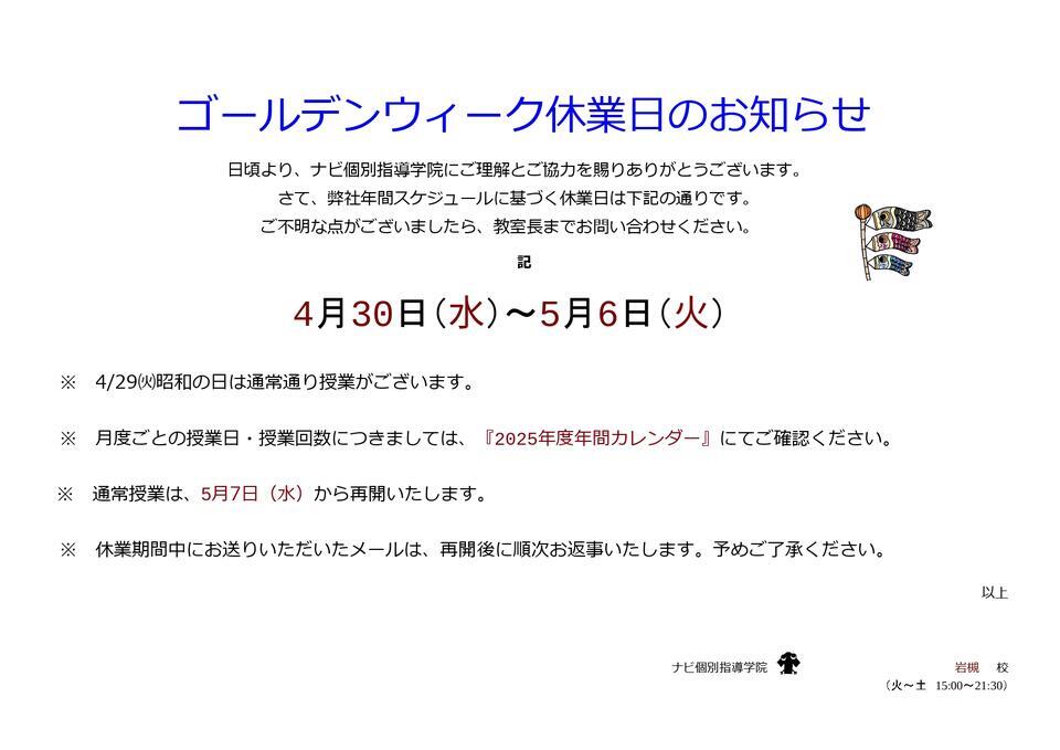 本日は、「ゴールデンウィーク休業日」のお知らせです。