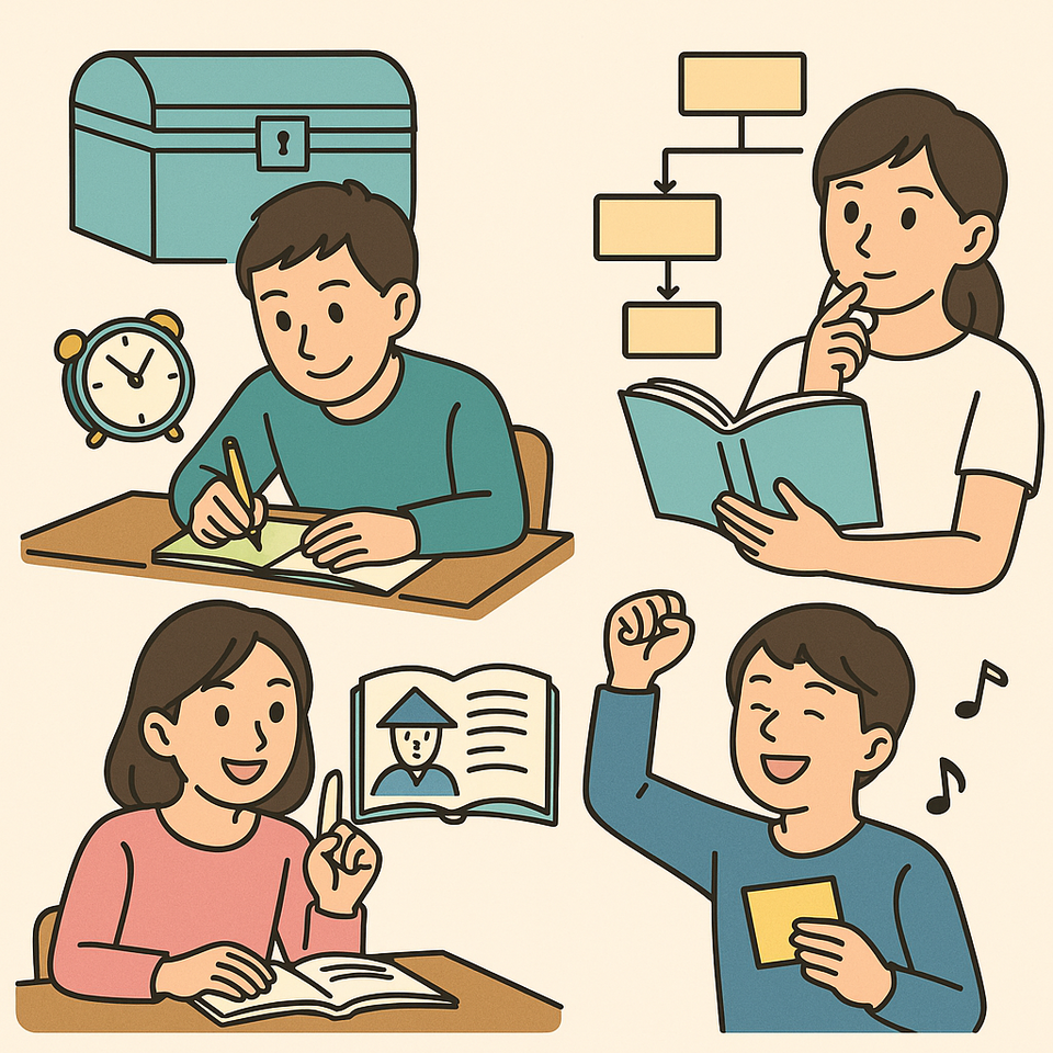 これらのテクニックは「ただ繰り返すだけ」ではなく、能動的・多感覚・ストーリー形式で記憶を働かせることにより、誰でも簡単に効果を感じられる方法です。「記憶する工夫を知っている」ことがポイントです。