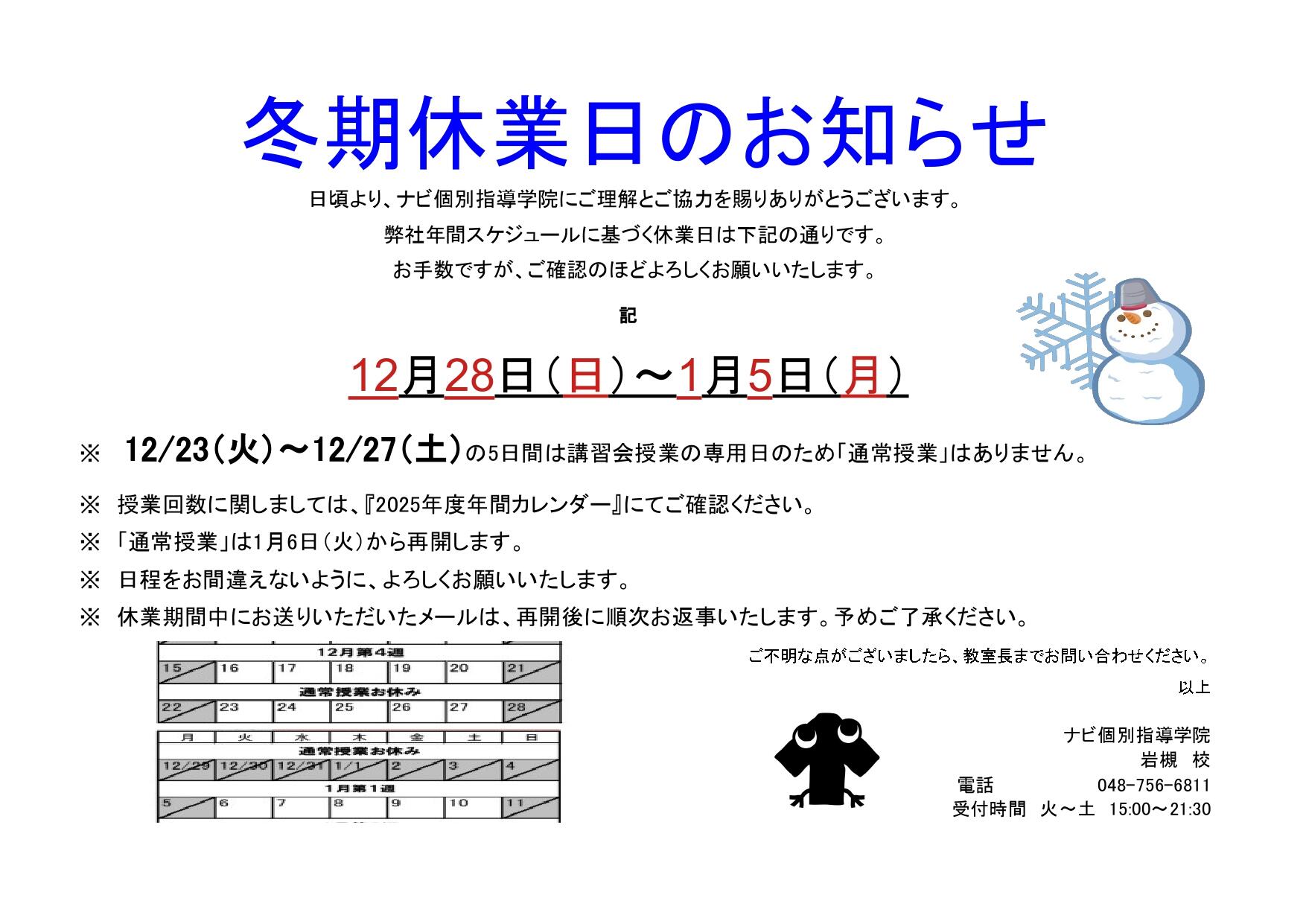 今回は、冬期休業日のお知らせになります。