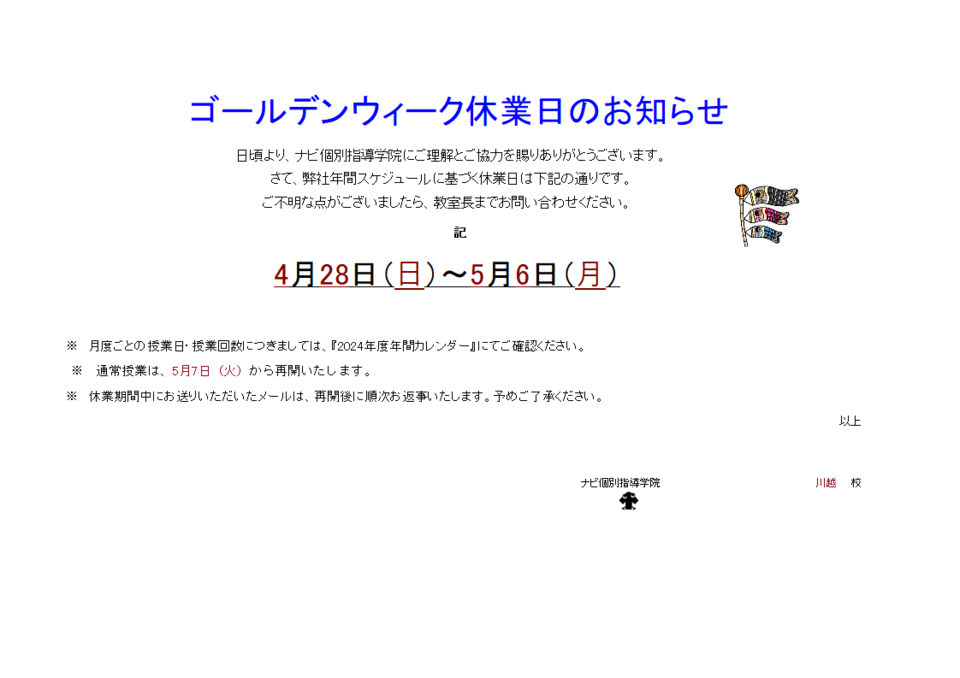 この期間は、通常授業・講習会授業につきましても実施いたしません。