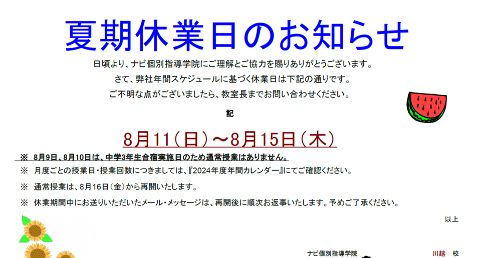 教室の夏期休業日等についてご案内いたします!