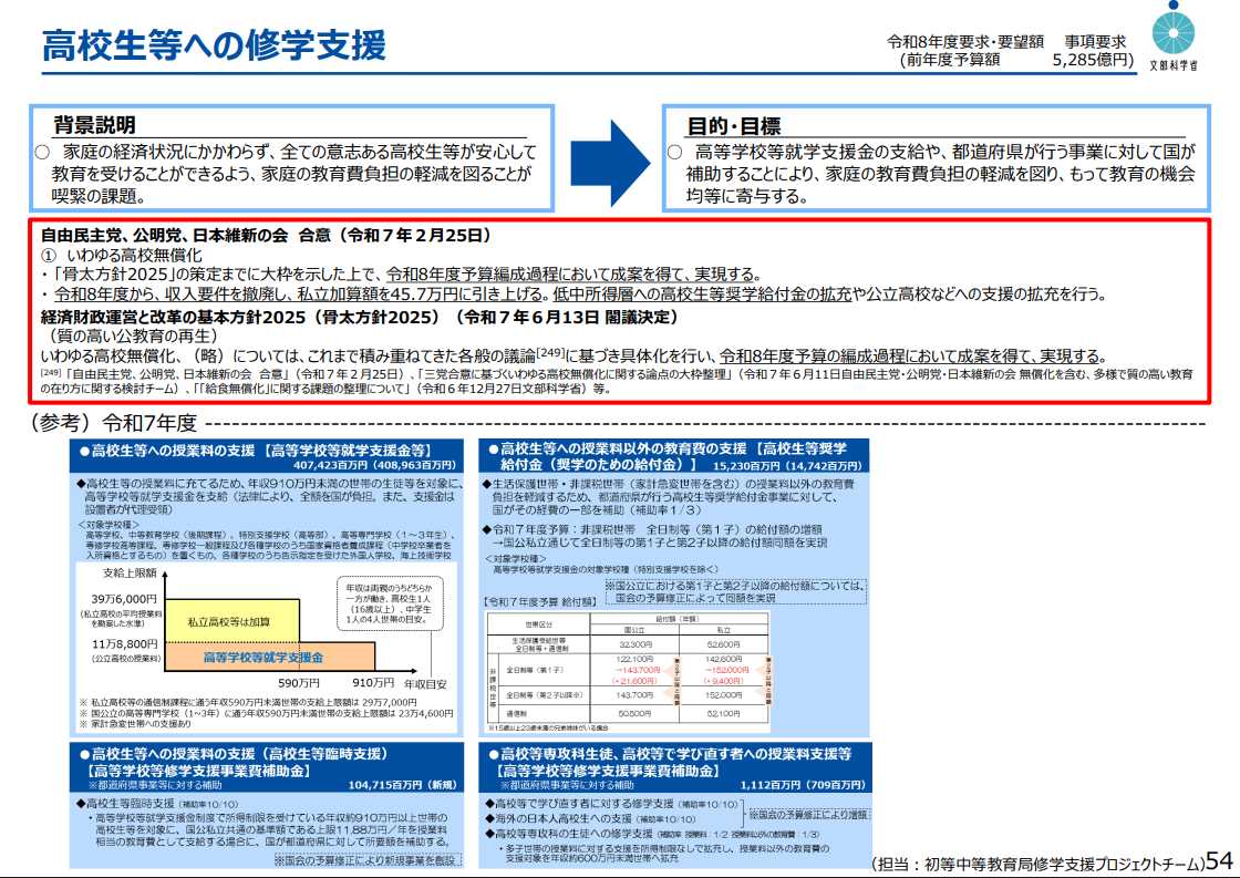 画像は今年の夏に文部科学省から出された概算要求の、高校無償化に関するページです。具体的な要求金額は出ていないので、来年度の4月から本当に実施されるのだろうか・・・?という疑念はありますが、まずは直近の自民党総裁選挙、そして年明けの通常国会でどのような議論が出るのかに注目したいと思います。