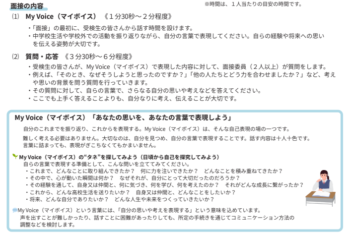面接試験は、学校によって個別or集団で実施され、入室して1分半から2分程度のMyVoice、その後にそれについて3分半から6分程度の質疑応答、という流れになるようです。