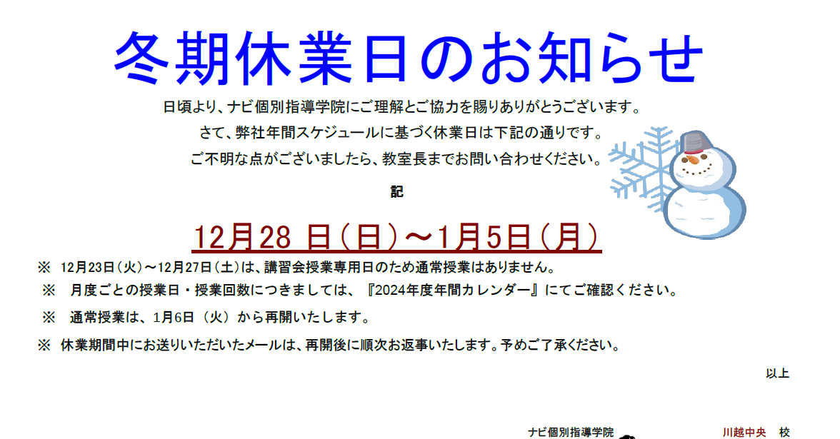 12月28日(日)から1月5日(月)が教室休業日となっております。