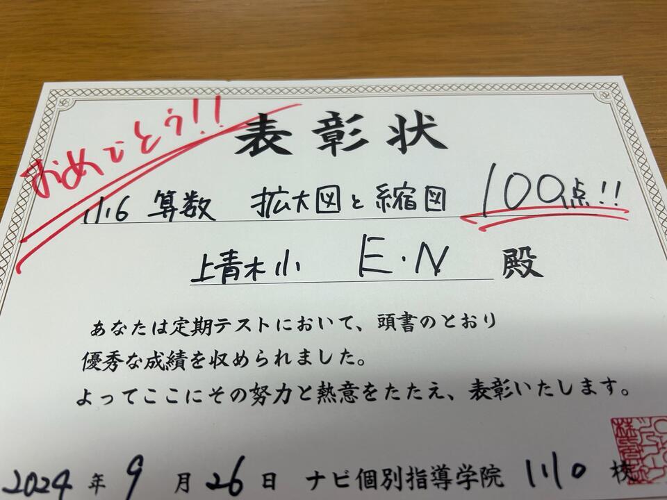 ナビ個別川口校では、学校のテストの結果によって、表彰状を作成しております。