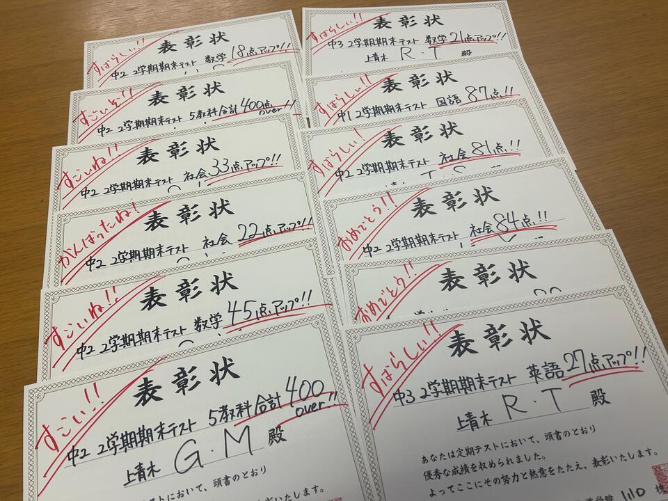 上青木中のTくんは、今回社会で81点を獲得したということで、表彰状をゲットしました!