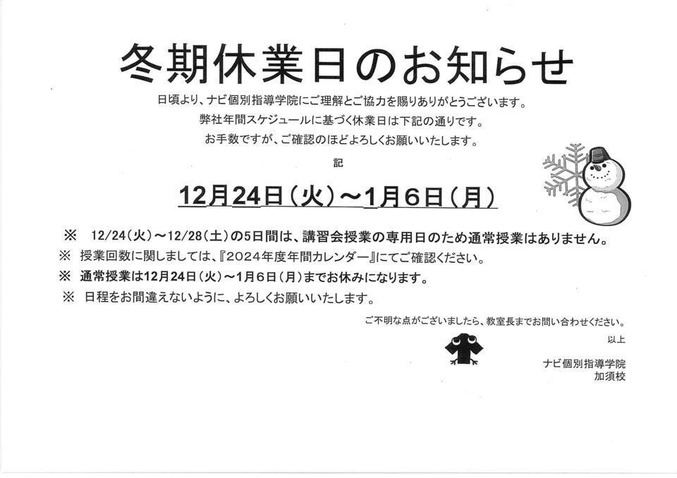 12/24㈫~12/28㈯は講習会専用日とさせていただきます。