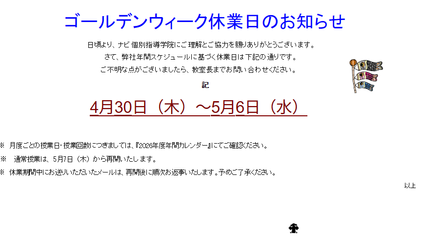 当塾のGW期間中の休校スケジュールについてお知らせいたします。