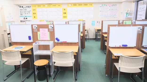 ナビ個別指導学院の授業は、個別の席ごとに設置された自分専用のホワイトボードで解き方や考え方を一緒に確認、それから生徒が問題を解くという「個別授業」スタイルです。