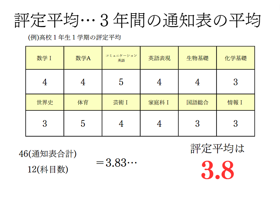 指定校推薦などは評定平均4.0以上という基準が多いですので