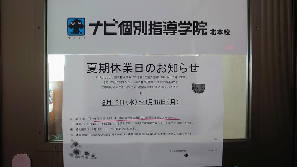 ※8/11(月)8/12(火)に関しましては、講習会専用日の為、通常授業はお休みです。