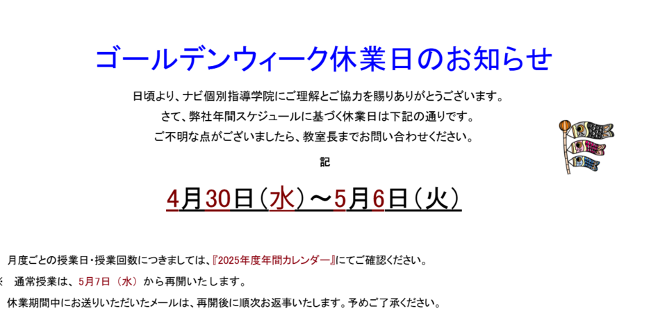 タイトルもあります通り、ナビ個別指導学院鴻巣校は休業に入ります。
