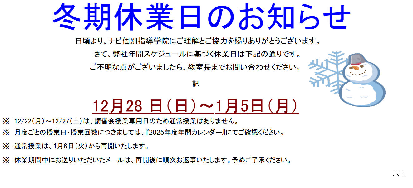 さて、明日からナビ個別指導学院鴻巣校は冬期休業に入ります。