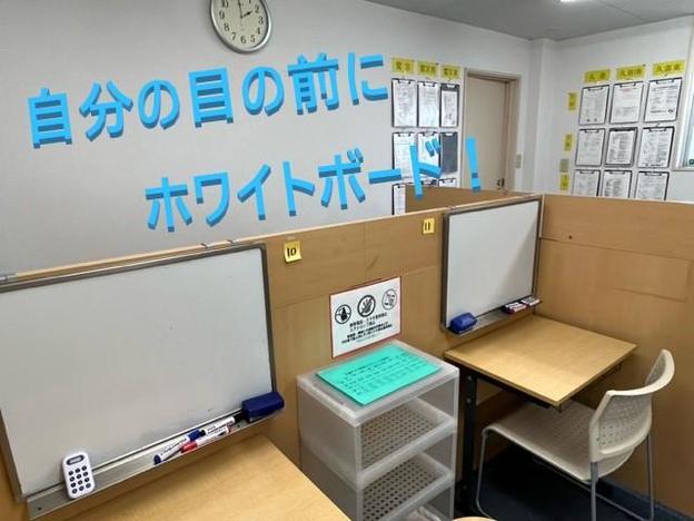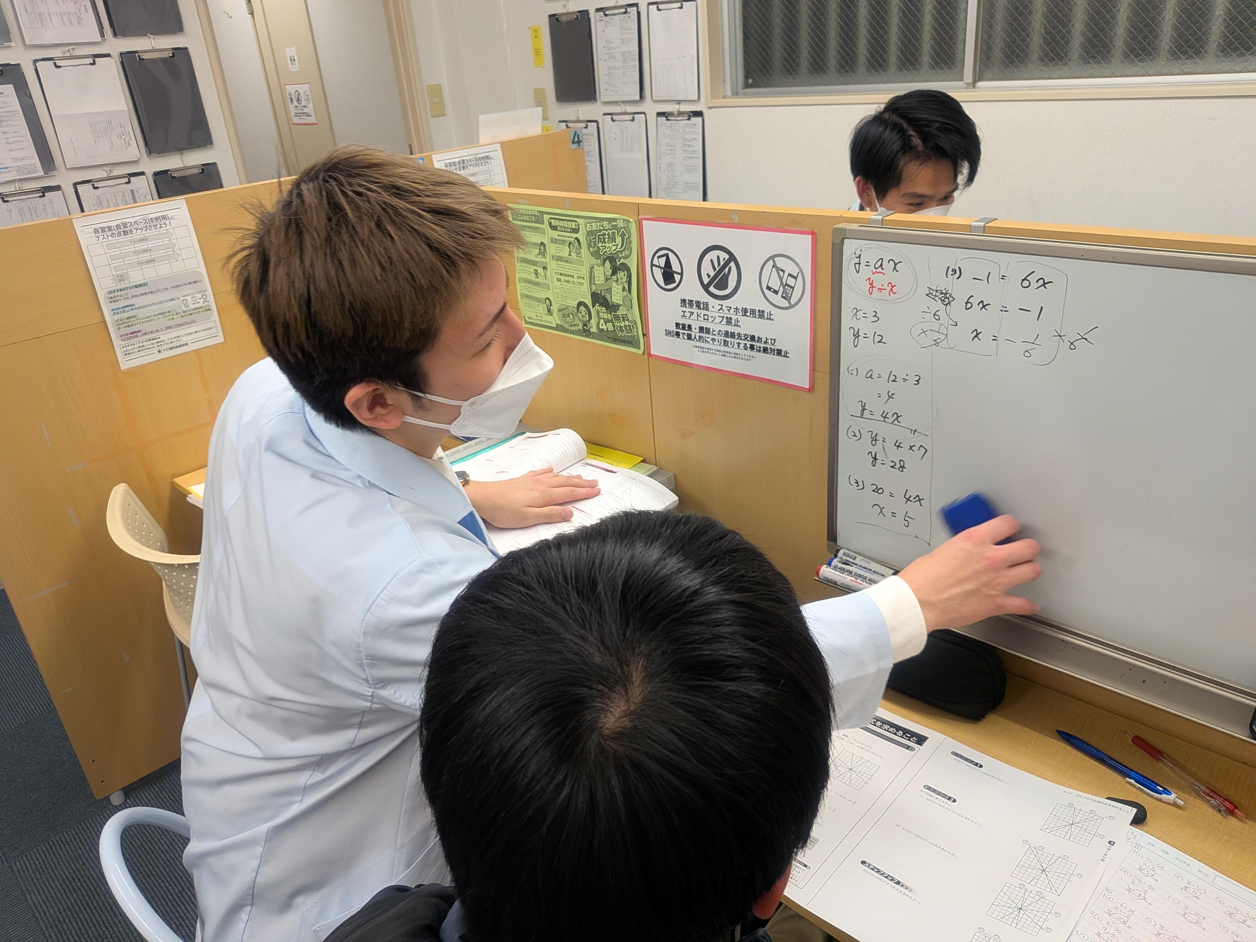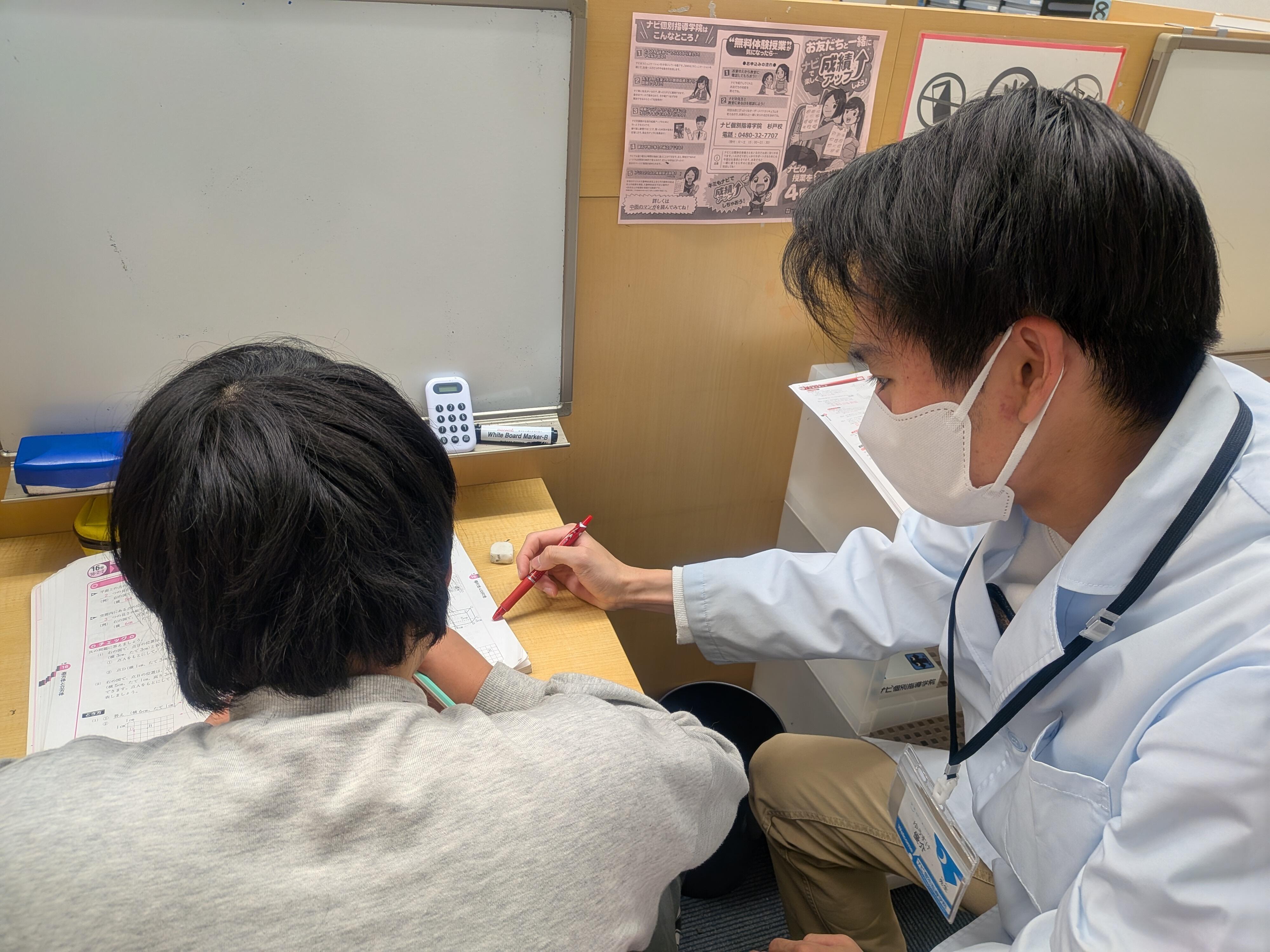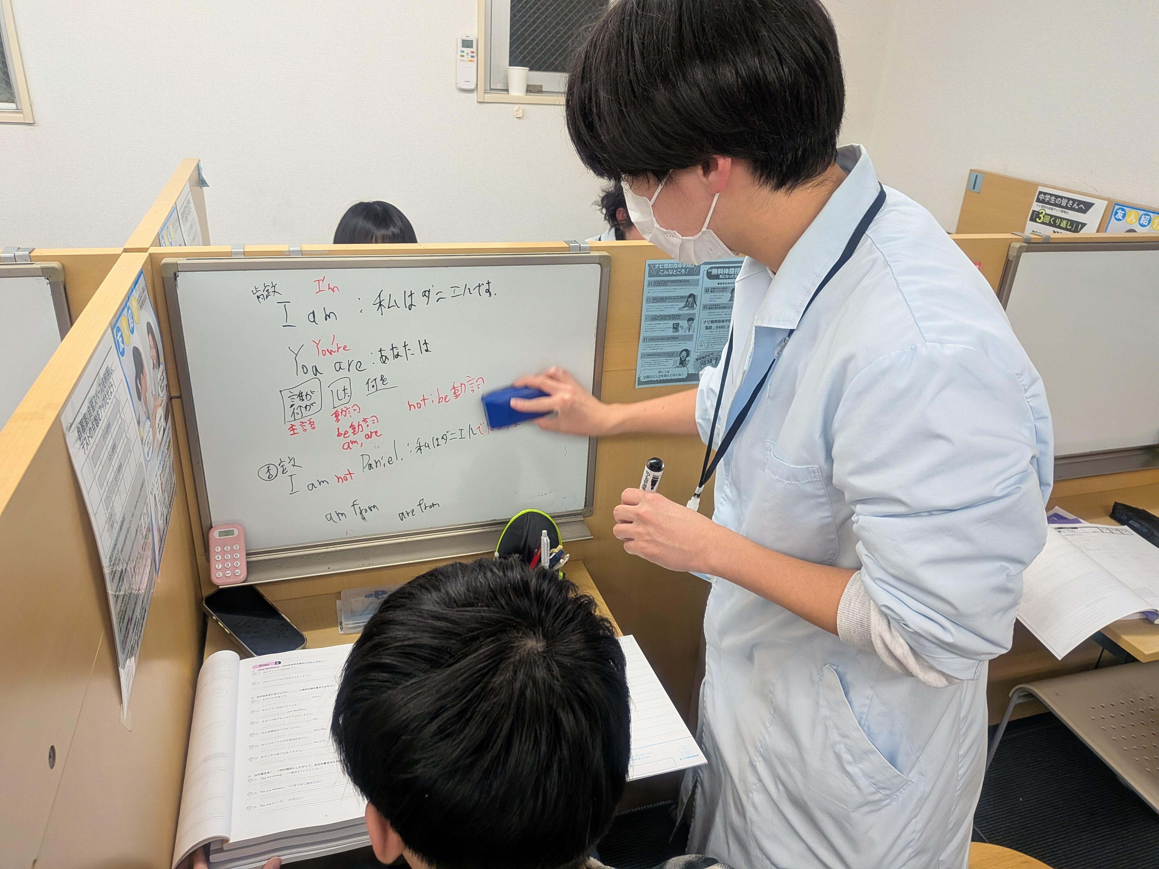 ナビ個別指導学院の授業は、個別の席ごとに設置された自分専用のホワイトボードで解き方や考え方を一緒に確認、それから生徒が問題を解くという「個別授業」スタイルです。