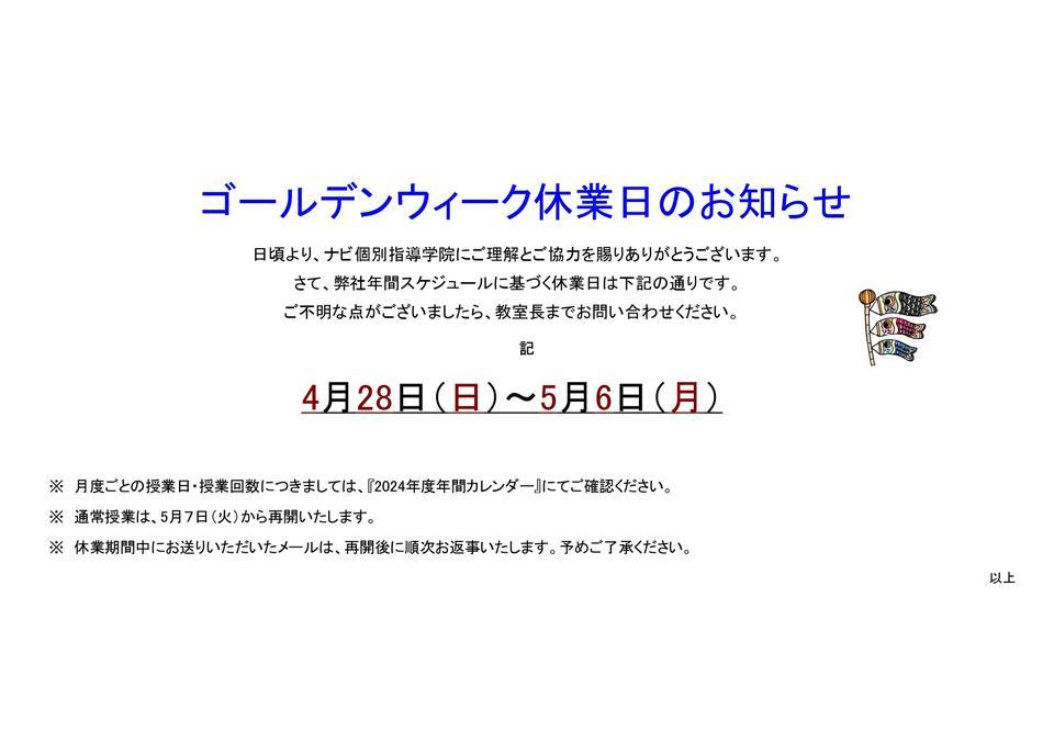 ナビ個別指導学院久喜校では4/28㈰~5/6㈪にてお休みをいただきます。